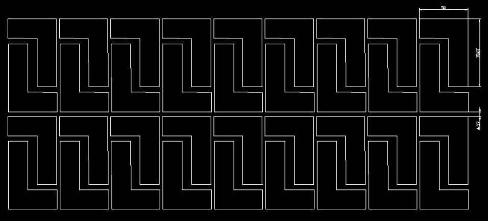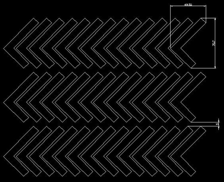 2、斜拼。將單片進行一定的傾斜,然后陣列,從而最大程度上利用拼版空間,如有弧度的條形、折形等;